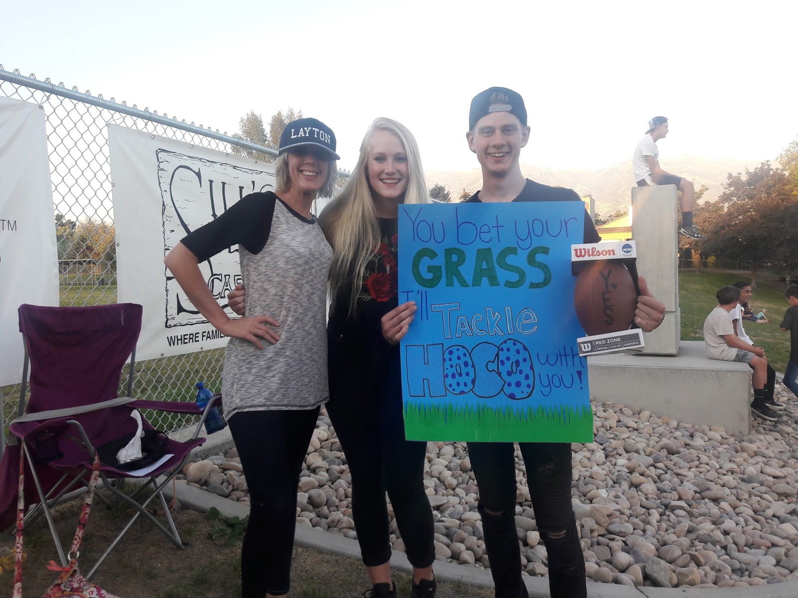 On Friday, we all went to the Layton game because Cam told me that she'd be answering Braxton to the dance. She is seriously the cutest dang thing ever. Like, of all time. Ever. They called Braxton's name up to the announcers booth and there was a poster and a football waiting for him. So cute!